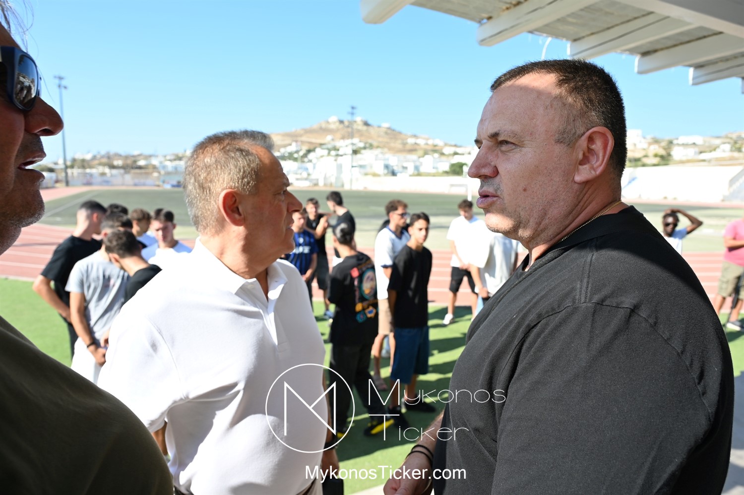 Στον σύντομο χαιρετισμό του προς τους παριστάμενους, ο Δήμαρχος Μυκόνου, Χρήστος Βερώνης, αφού ευχήθηκε στους ποδοσφαιριστές, συνεχάρη τον πρόεδρο και μέλη του Δ.Σ της ΑΕ Μυκόνου για το έργο που επιτελούν, εξέφρασε την έμπρακτη στήριξη του Δήμου στην αναβάθμιση του αθλητισμού.