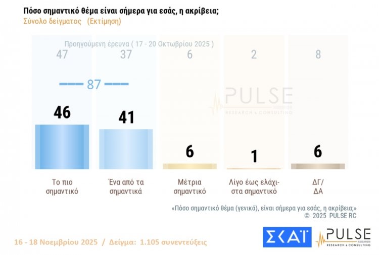 Η ακρίβεια φαίνεται πως απασχολεί το 87% των ερωτηθέντων καθώς σε ερώτημα «πόσο σημαντικό είναι σήμερα για εσάς το θέμα» καταγράφονται τα εξής: