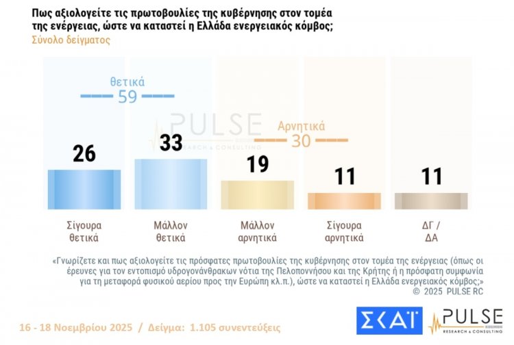 Ειδικότερα, απαντώντας στο ερώτημα «πώς αξιολογείτε τις πρωτοβουλίες της κυβέρνησης στον τομέα της ενέργειας, ώστε να καταστεί η Ελλάδα ενεργειακός κόμβος» το 59% απαντά ΘΕΤΙΚΑ και το 30% ΑΡΝΗΤΙΚΑ.