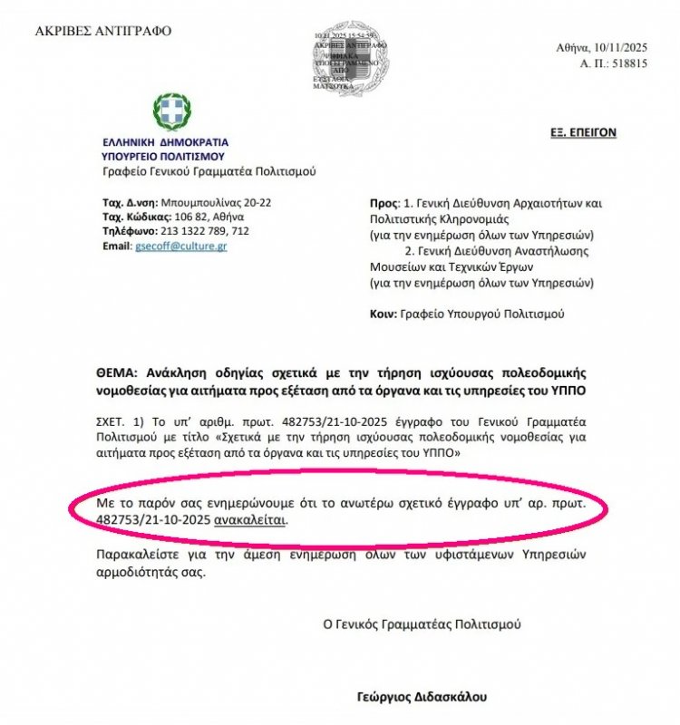 Η νέα εγκύκλιος του ΓΓ Πολιτισμού που ανακαλεί την προηγούμενη του ιδίου