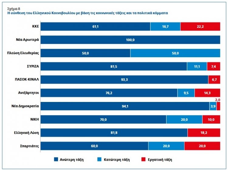 Από την άλλη, η Νέα Αριστερά, το σύνολο της κοινοβουλευτικής ομάδας αποτελείται από βουλευτές της ανώτερης τάξης, ενώ το κυβερνών κόμμα (ΝΔ) αλλά και η αξιωματική αντιπολίτευση (ΠΑΣΟΚ - ΚΙΝΑΛ) αγγίζουν ποσοστά της τάξης του 95% στους βουλευτές τους που προέρχονται από την ανώτερη τάξη. Στο σύνολο της σύνθεσης της Βουλής, το 87% προέρχεται από την ανώτερη τάξη, 6,9% από την κατώτερη τάξη και 6,1% από την εργατική τάξη.