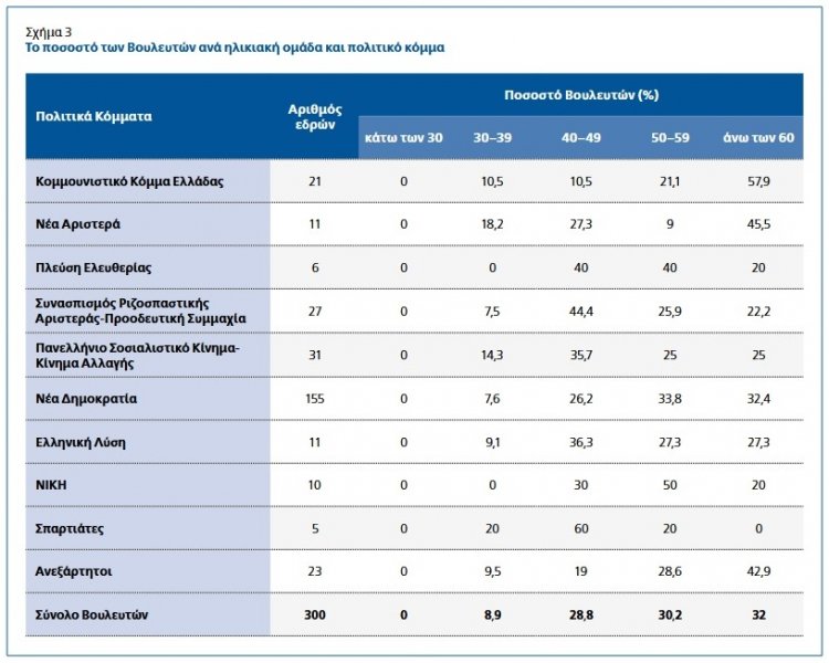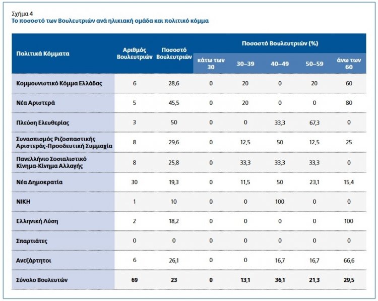 Συγκεκριμένα, οι μισές βουλεύτριες της Νέας Δημοκρατίας προέρχονται από την ηλικιακή κατηγορία 40-49 ετών, ενώ το 60% και το 80% των βουλευτριών που ανήκουν στις κοινοβουλευτικές ομάδες του ΚΚΕ και της Νέας Αριστεράς, αντίστοιχα, ανήκουν στην ηλικιακή κατηγορία των 60 ετών και άνω.