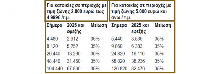 - για κατοικίες σε περιοχές με τιμές ζώνης από 2.800 έως 4.999 ευρώ/τ.μ. το τεκμαρτό θα προσαυξάνεται πλέον κατά 30% και όχι κατά 40%. Έτσι η αντικειμενική δαπάνη μειώνεται συνολικά κατά 35%