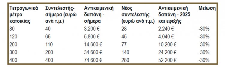 - κατά 30% για κατοικίες σε περιοχές με Τιμή Ζώνης κάτω από 2.800 ευρώ ανά τετραγωνικό. Για σπίτια έως 80 τ.μ., ο συντελεστής μειώνεται από 40 σε 28 ευρώ ανά τ.μ. και η αντίστοιχη μείωση της αντικειμενικής δαπάνης από 3.200 ευρώ σε 2.240 ευρώ (-30%). Ενώ για κατοικίες 120 τ.μ., η αντικειμενική δαπάνη μειώνεται από 5.800 σε 4.040 ευρώ.