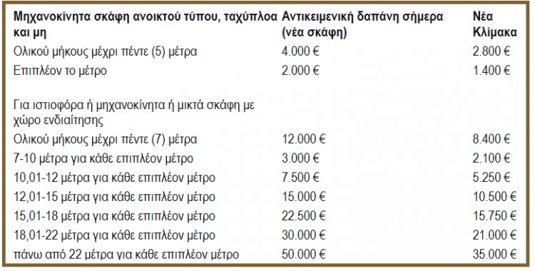 Για τα σκάφη σήμερα η τεκμαρτή δαπάνη από κάθε σκάφος μειώνεται ανάλογα με την παλαιότητά του κατά 15% αν έχουν παρέλθει πάνω από 5 έτη από το έτος που νηολογήθηκε για πρώτη φορά, ή και 30% αν έχουν παρέλθει 10 έτη. Με το νέο καθεστώς, μειώνεται κατά 30% η τεκμαρτή δαπάνη και για τα νεότερα σκάφη, καθώς οι δαπάνες συντήρησης δεν είναι υψηλότερες στα νεότερα.