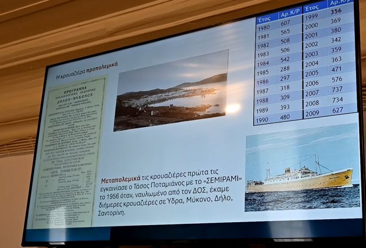 Εδώ βλέπουμε πως ήταν η Μύκονος το 1873, όπου μπροστά από το Δημαρχείο είχε γεφυράκι, που παίρναγε το νερό. Αυτή ήταν η Μύκονος τότε. Ο τουρισμός όπως βλέπετε, τα πρώτα κρουαζιερόπλοια είναι το 1923, τα οποία ξεκινούσαν να πάνε Δήλο Μύκονο, ενώ μεταπολεμικά ήταν το κρουαζιερόπλοιο «Semiramis” του Ποταμιάνου το 1956. Άρα η κρουαζιέρα σε εμάς είναι ένα φαινόμενο, το γνωρίζομε, κουλτούρας.