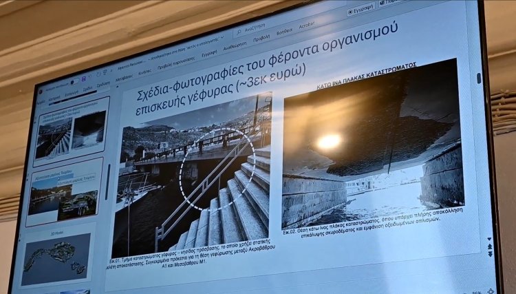 Ενώ η επόμενη διαφάνεια δείχνει κάτω απ' τη γέφυρα, ότι πρέπει να γίνει ένα έργο που είναι έτοιμο καιρό, της τάξεως των 3 εκατομμυρίων σύν, προκειμένου να αποκατασταθεί η γέφυρα, διότι με τα χρόνια ο οπλισμός έχει χαλάσει και υπάρχει μελέτη από το Δημοτικό Λιμενικό Ταμείο, εδώ και κάποια χρόνια.