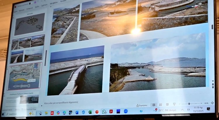 Εκεί λοιπόν, εδώ είναι η επέκταση του Χερσαίου χώρου λιμένος Μυκόνου που τελείωσε το 2010, ένα έργο το οποίο χρήζει επισκευής, διότι οι κυβόλιθοι και τα φανάρια έχουν φαγωθεί, υπάρχει μια μελέτη δύο εκατομμυρίων η οποία δεν φτάνει, γιατί και τα φανάρια θέλουν αλλαγή.