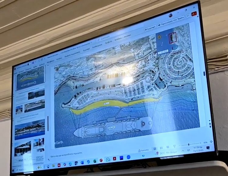 Και πάμε στο επόμενο, όπου εδώ, κ. Υπουργέ, δείχνει πώς μπορεί ένα κρουαζιερόπλοιο, ένα μπάζωμα που μπορεί να γίνει κατά την άποψή μου, μπορεί και μεγαλύτερο και με μια εύκαμπη κατασκευή, φαίνεται ένα σχήμα, ένα σκίτσο, μπορεί εκεί να βγαίνει απευθείας, έναν κρουαζιερόπλοιο στην πόλη, και στο βάθος μέσα, το αλιευτικό καταφύγιο, επάνω ψηλά που δείχνουν κάτι κτιριάκια, είναι ο Ναυτικός Ομιλος που μελετάει τώρα το Δημοτικό Λιμενικό Ταμείο, και άλλα.