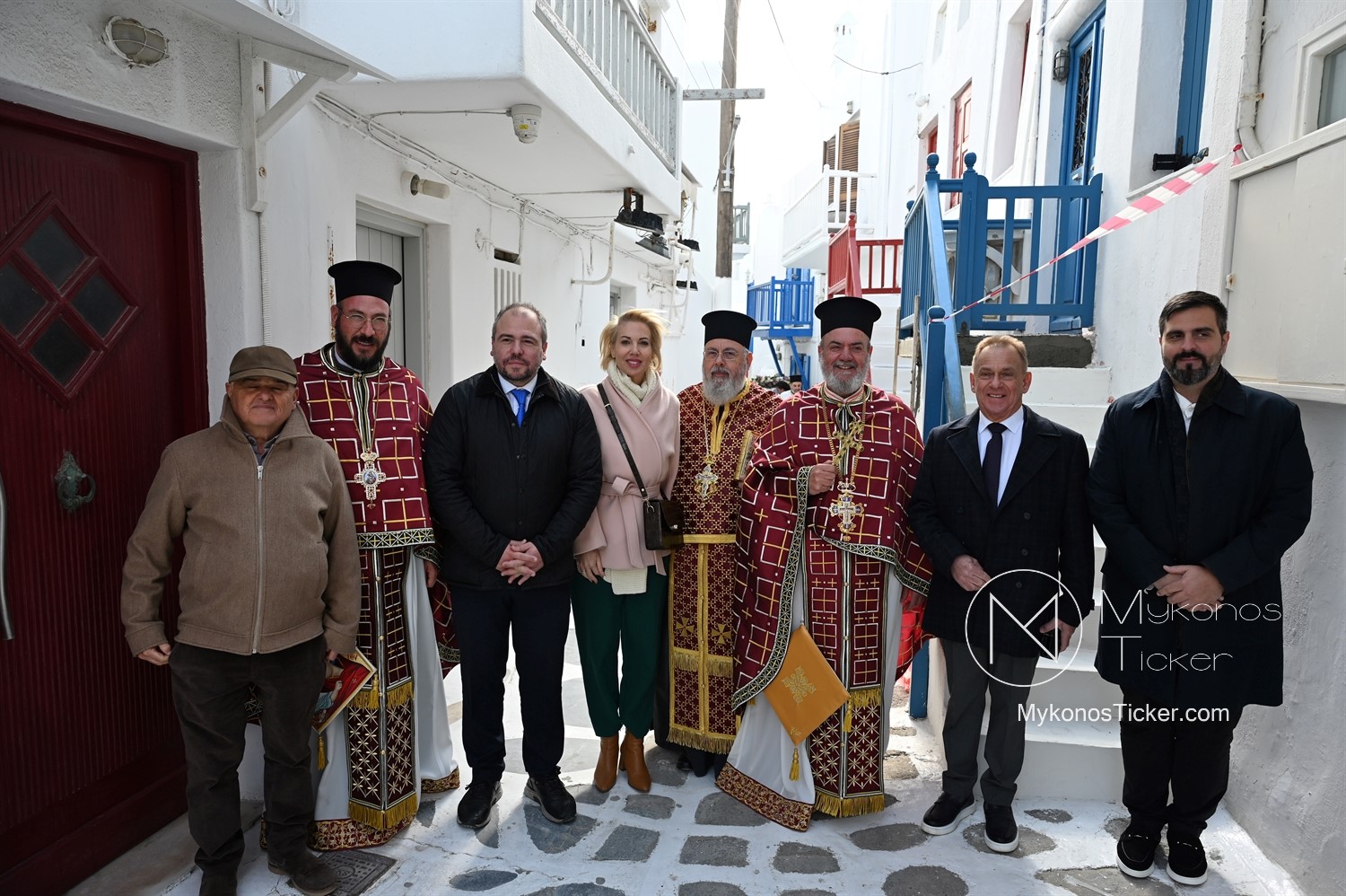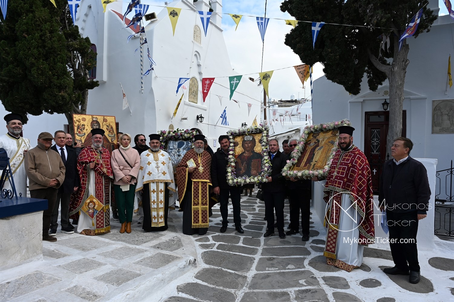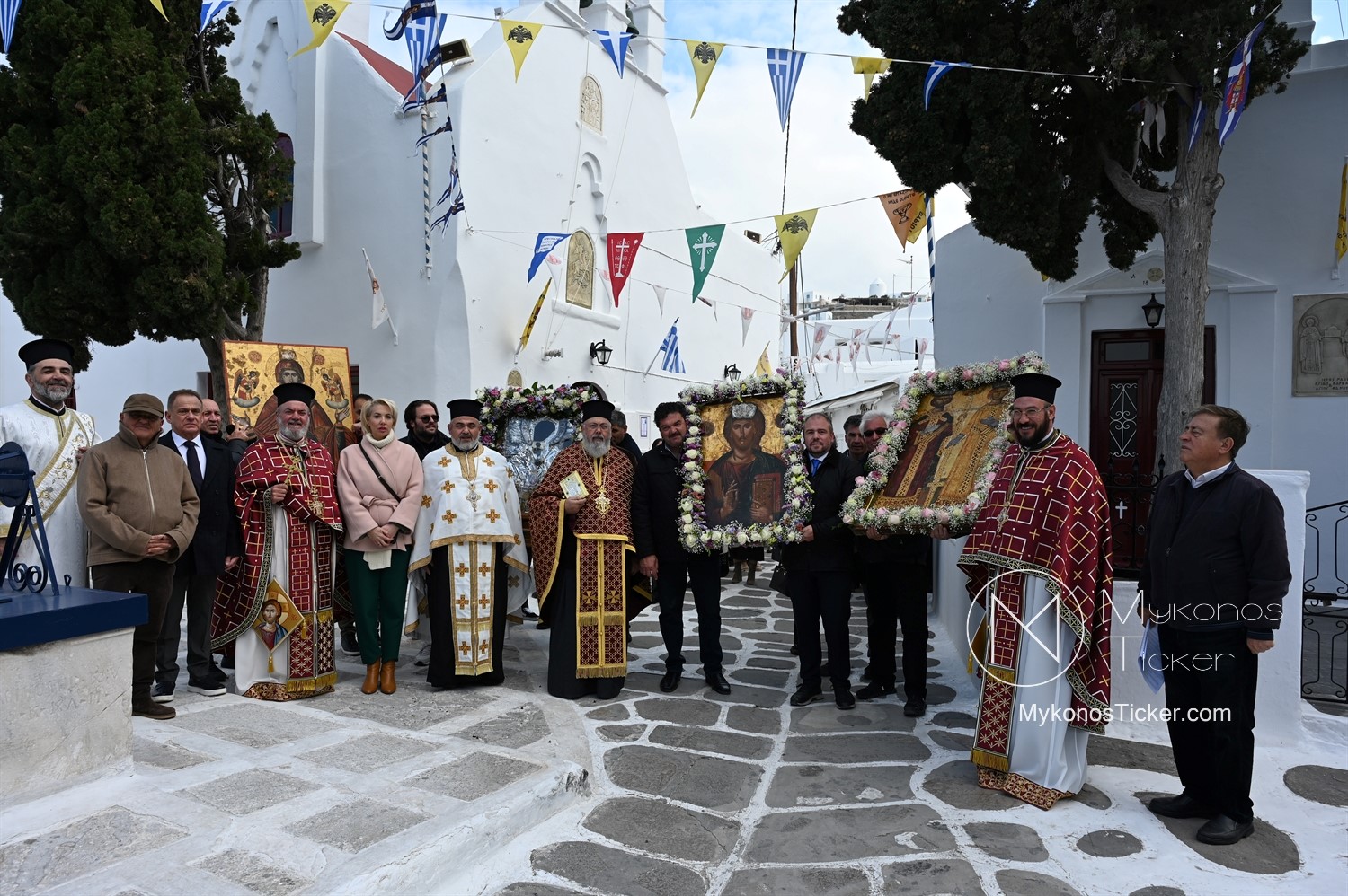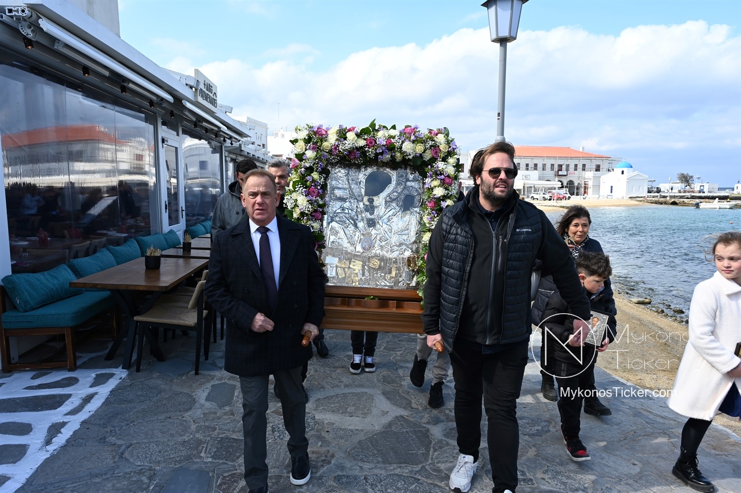 Ακολούθως, το αναστάσιμο και ελπιδοφόρο μήνυμα της Ορθοδοξίας μεταφέρθηκε εκτός του Ναού. Υπό τις ευλογίες των ιερέων και με την αθρόα συμμετοχή κλήρου και λαού από τις όμορες ενορίες της Αγίας Κυριακής και της Παναχράντου, πραγματοποιήθηκε η καθιερωμένη λιτάνευση των Αγίων Εικόνων στα γραφικά σοκάκια της Χώρας Μυκόνου, μεταφέροντας την πνευματική χαρά της ημέρας σε όλο το νησί.