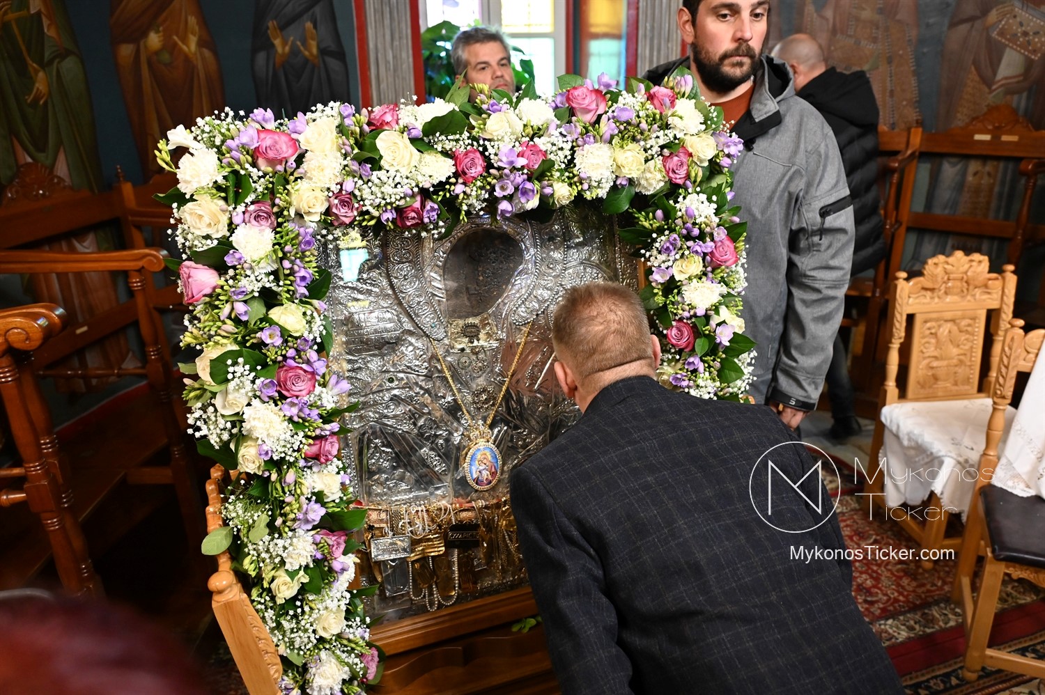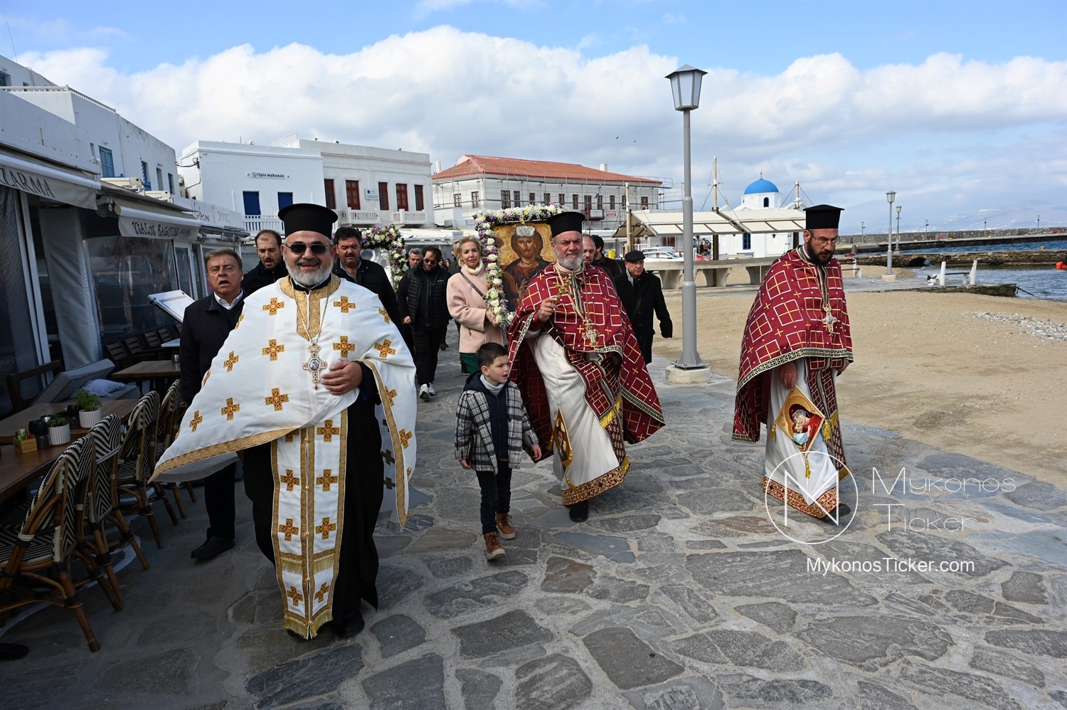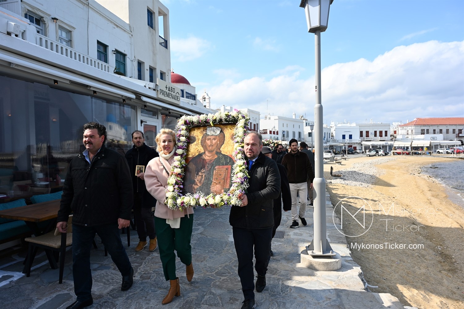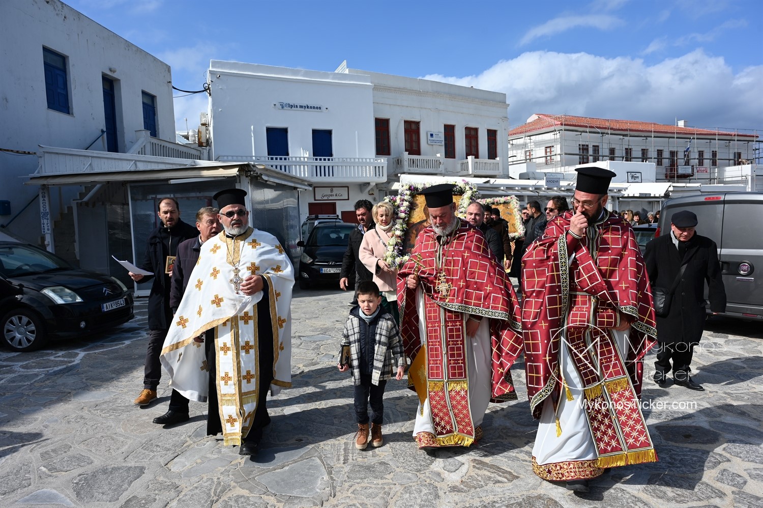Ακολούθως, το αναστάσιμο και ελπιδοφόρο μήνυμα της Ορθοδοξίας μεταφέρθηκε εκτός του Ναού. Υπό τις ευλογίες των ιερέων και με την αθρόα συμμετοχή κλήρου και λαού από τις όμορες ενορίες της Αγίας Κυριακής και της Παναχράντου, πραγματοποιήθηκε η καθιερωμένη λιτάνευση των Αγίων Εικόνων στα γραφικά σοκάκια της Χώρας Μυκόνου, μεταφέροντας την πνευματική χαρά της ημέρας σε όλο το νησί.