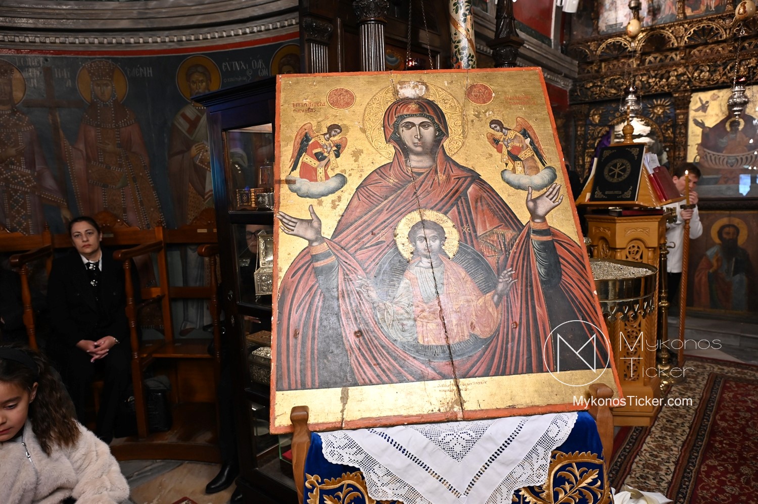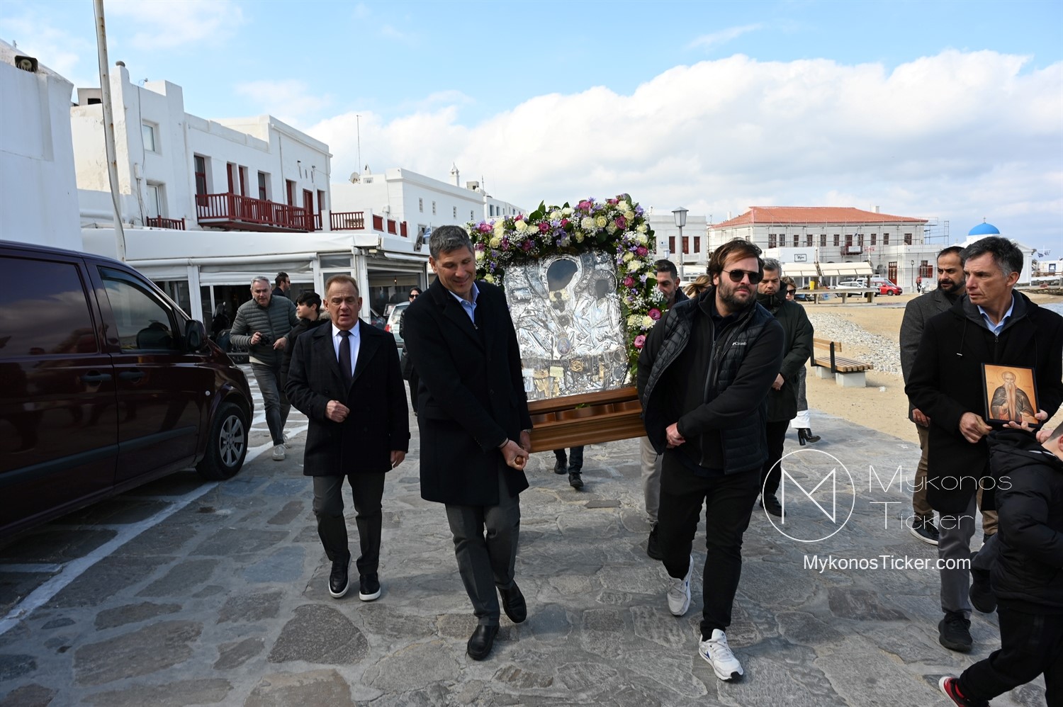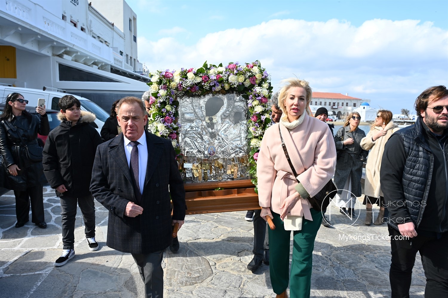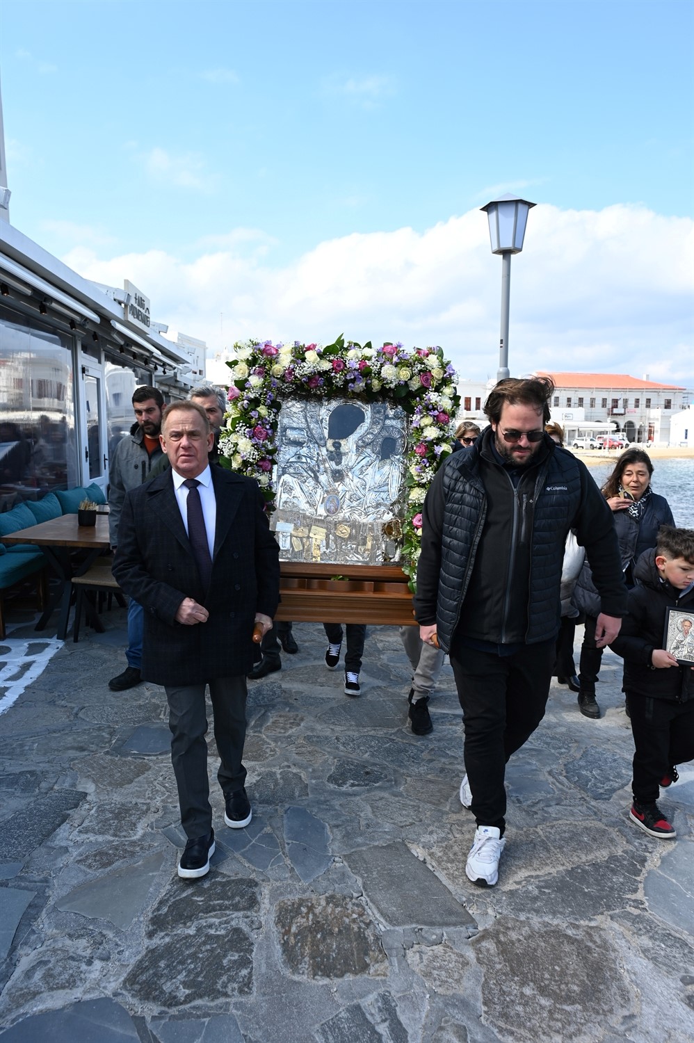 Ακολούθως, το αναστάσιμο και ελπιδοφόρο μήνυμα της Ορθοδοξίας μεταφέρθηκε εκτός του Ναού. Υπό τις ευλογίες των ιερέων και με την αθρόα συμμετοχή κλήρου και λαού από τις όμορες ενορίες της Αγίας Κυριακής και της Παναχράντου, πραγματοποιήθηκε η καθιερωμένη λιτάνευση των Αγίων Εικόνων στα γραφικά σοκάκια της Χώρας Μυκόνου, μεταφέροντας την πνευματική χαρά της ημέρας σε όλο το νησί.