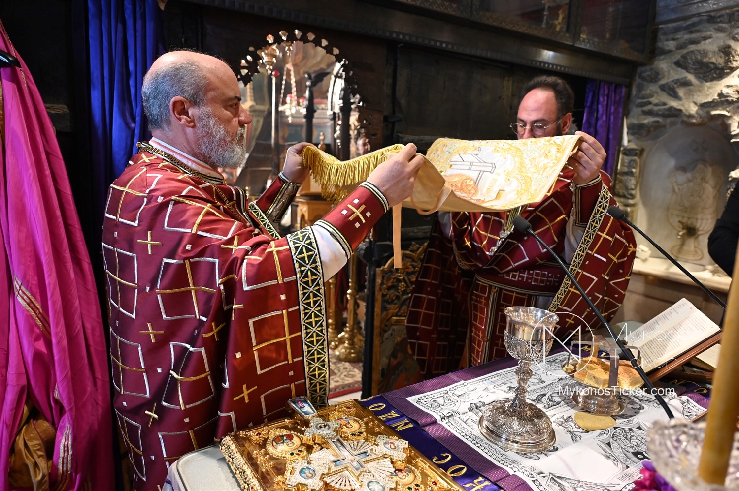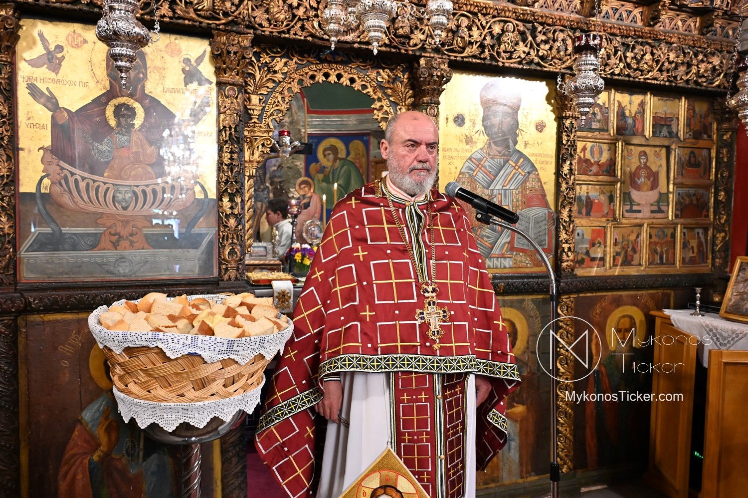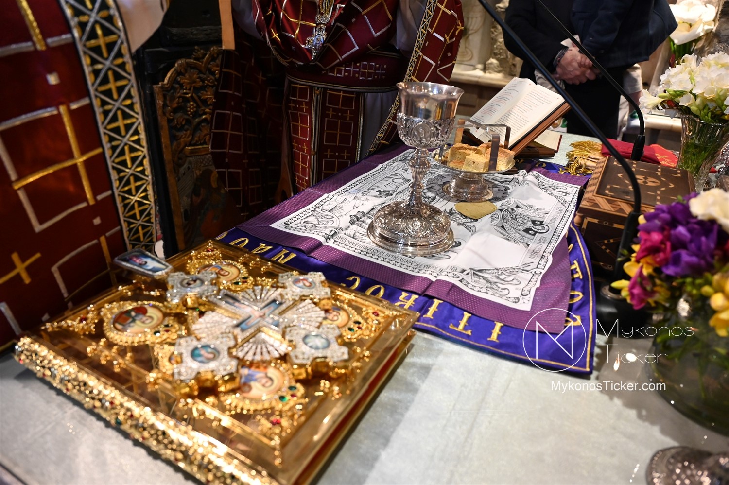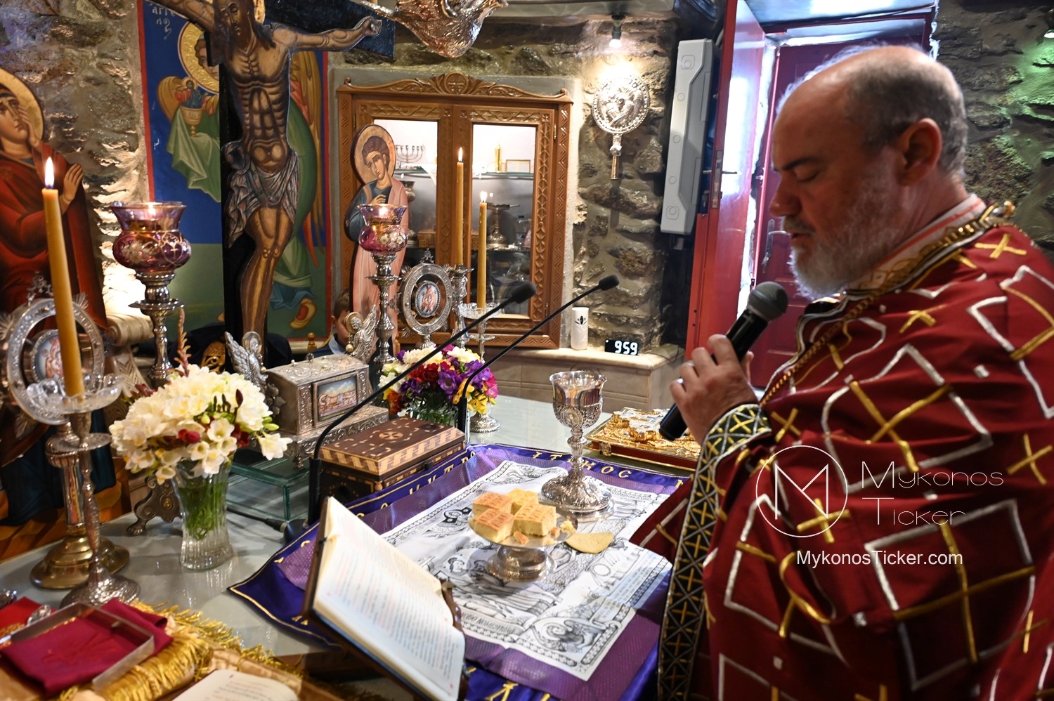 Η Συνοδική Θεία Λειτουργία τελέστηκε με κάθε ιεροπρέπεια από τον Αρχιερατικό Επίτροπο Δήλου και Μυκόνου, Αιδεσιμολογιώτατο π. Πέτρο Μαραγκό, συλλειτουργούντος του Αιδεσιμολογιώτατου π. Γεωργίου Κουσαθανά. Επιβεβαιώνοντας την άρρηκτη συμπόρευση της τοπικής κοινωνίας με την Εκκλησία, δίπλα στον Δήμαρχο Χρήστο Βερώνη, παρέστησαν οι Βουλευτές Κυκλάδων, Κατερίνα Μονογυιού και Φίλιππος Φόρτωμας, καθώς και πλήθος Δημοτικών και Περιφερειακών Συμβούλων.