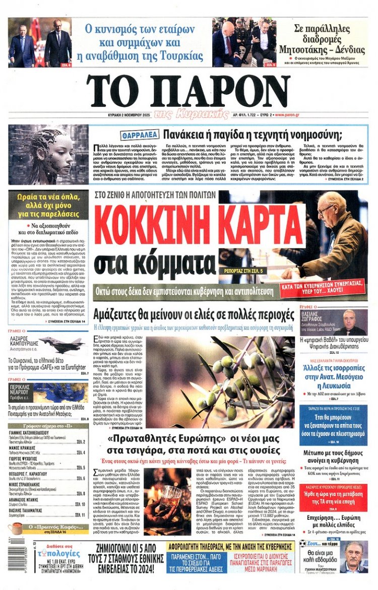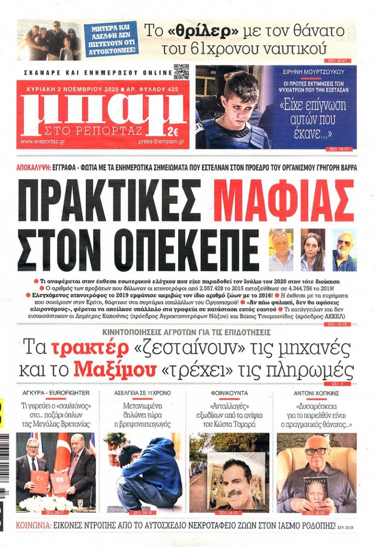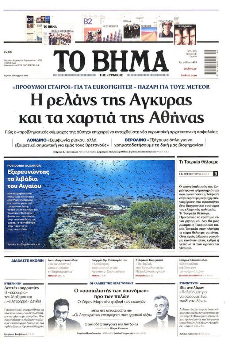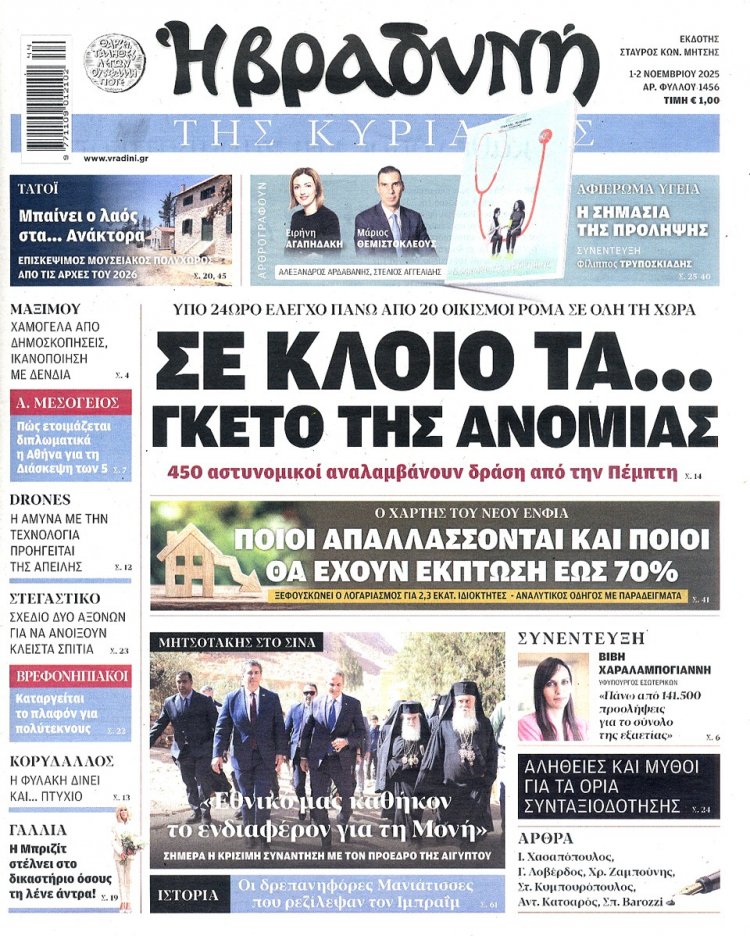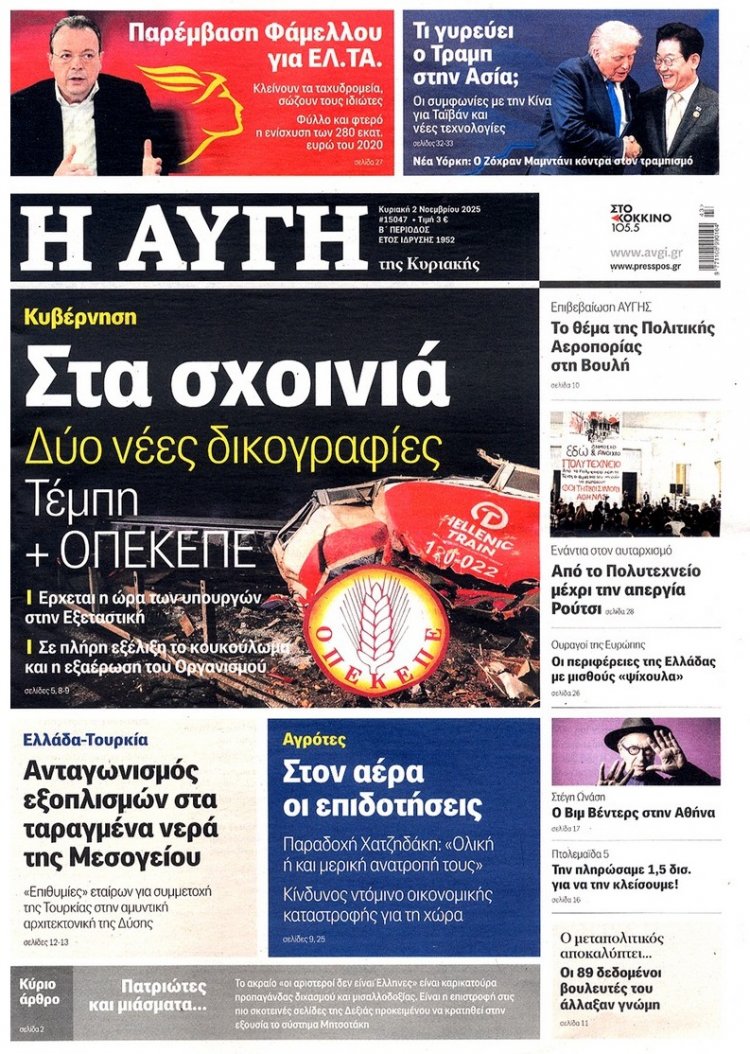 Sunday's front pages: Τα Πρωτοσέλιδα και τα Οπισθόφυλλα των εφημερίδων της Κυριακής 2 Νοεμβρίου 2025