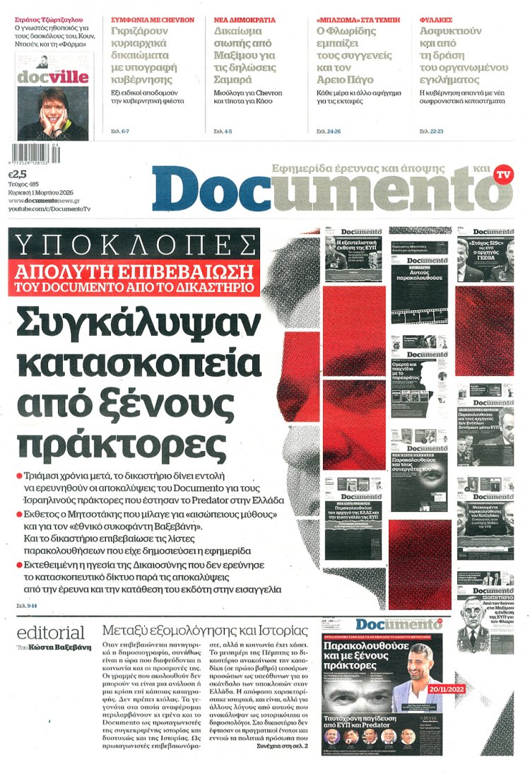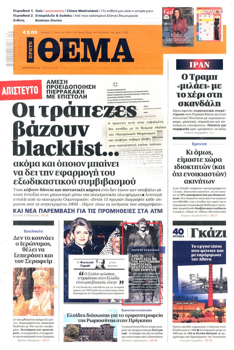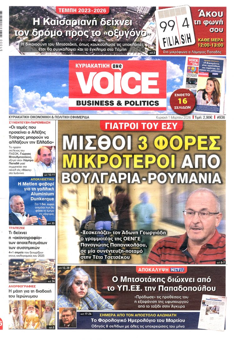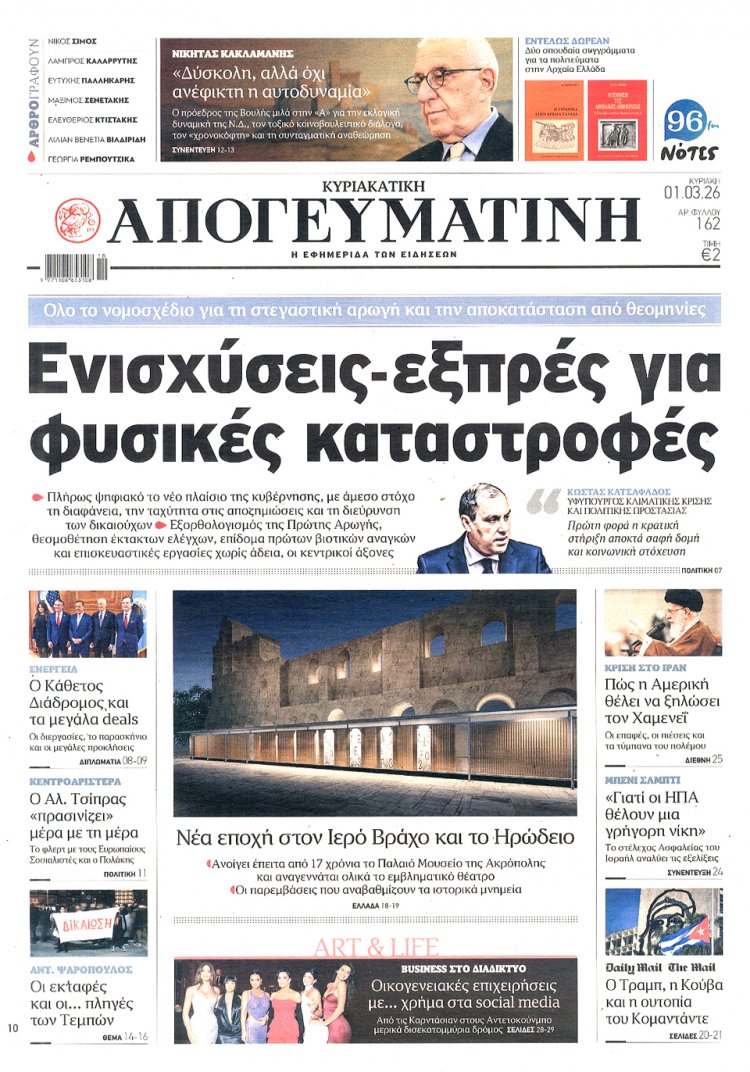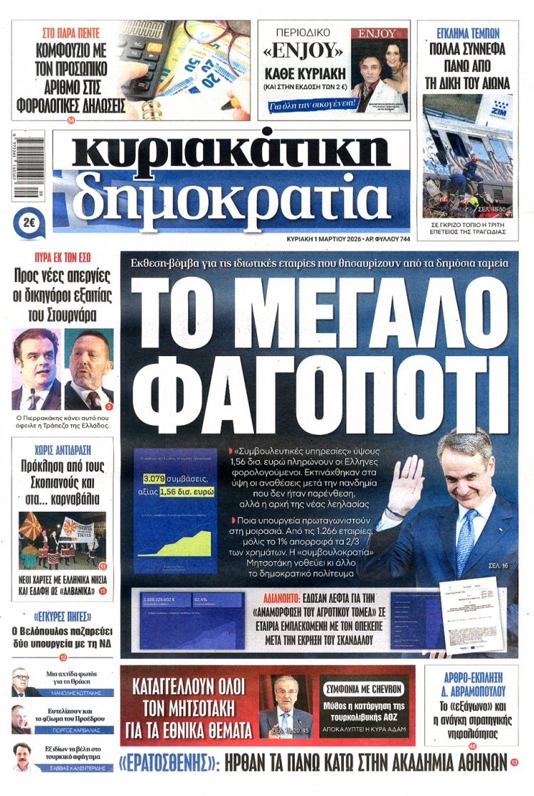 Την Κυριακή, 1 Μαρτίου 2026, ο ελληνικός Τύπος αποτυπώνει την εικόνα μιας χώρας που κινείται σε δύο εντελώς διαφορετικές ταχύτητες. Το Κέντρο και η Δεξιά προβάλλουν ένα προφίλ θωράκισης με διεθνείς συμφωνίες και κρατικό εκσυγχρονισμό. Ταυτόχρονα, σύσσωμος σχεδόν ο υπόλοιπος Τύπος αναδεικνύει τεράστια θεσμικά και κοινωνικά ρήγματα, εστιάζοντας στο κράτος δικαίου, τις οικονομικές ανισότητες και τα ανοιχτά εθνικά τραύματα.