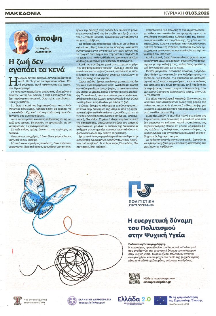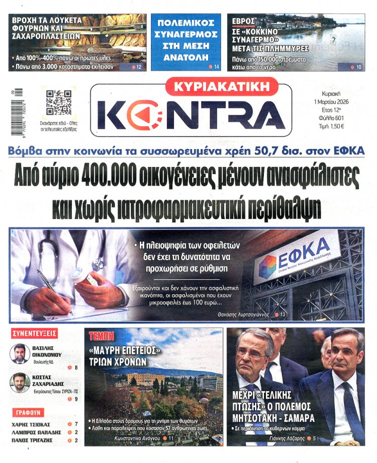 Η «Ελλάδα των άκρων» στα πρωτοσέλιδα (1/3/26). Όταν το αφήγημα των εξοπλισμών συγκρούεται με το τραύμα των Τεμπών, το Predator & την ασφυξία των τραπεζών. Διαβάστε στο Mykonos Ticker.