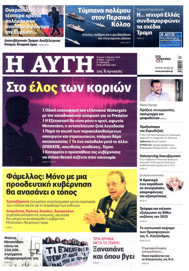 The Greek front pages for Sunday, March 1, 2026, present a deeply polarized national narrative. While the government promotes major defense agreements with France and the US, the press focuses heavily on the resurfacing Predator wiretapping scandal, the Tempi train tragedy anniversary, and a tightening economic squeeze on citizens.