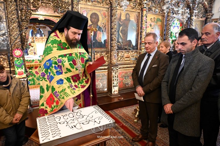 Ο Δήμαρχος Χρήστος Βερώνης μαζί με Αντιδημάρχους, Δημοτικούς και Κοινοτικούς Συμβούλους, παρακολούθησε τη Θεία Λειτουργία και τη Δοξολογία της Πρωτοχρονιάς, που τελέσθησαν από τον Πανοσιολογιώτατο Αρχιμανδρίτη και Καθηγούμενο της Ιεράς Μονής Παναγίας Τουρλιανής π. Αλέξιο Παπαδόπουλο.πλαισιούμενος από τον ιεροδιάκονο Φιλάρετο με την συμπροσευχητική παρουσία Μυκονίων πιστών.